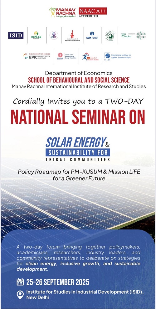 The Department of Economics, School of Behavioural and Social Science, Manav Rachna International Institute of Research and Studies, with the support of its funding partners — Indian Council of Social Science Research (ICSSR), Chintan Research Foundation (CRF), and ReGlo Industries Pvt. Ltd. — is organizing a Two-Day National Seminar on “Solar Energy & Sustainability for Tribal Communities” at the Institute for Studies in Industrial Development (ISID), New Delhi.